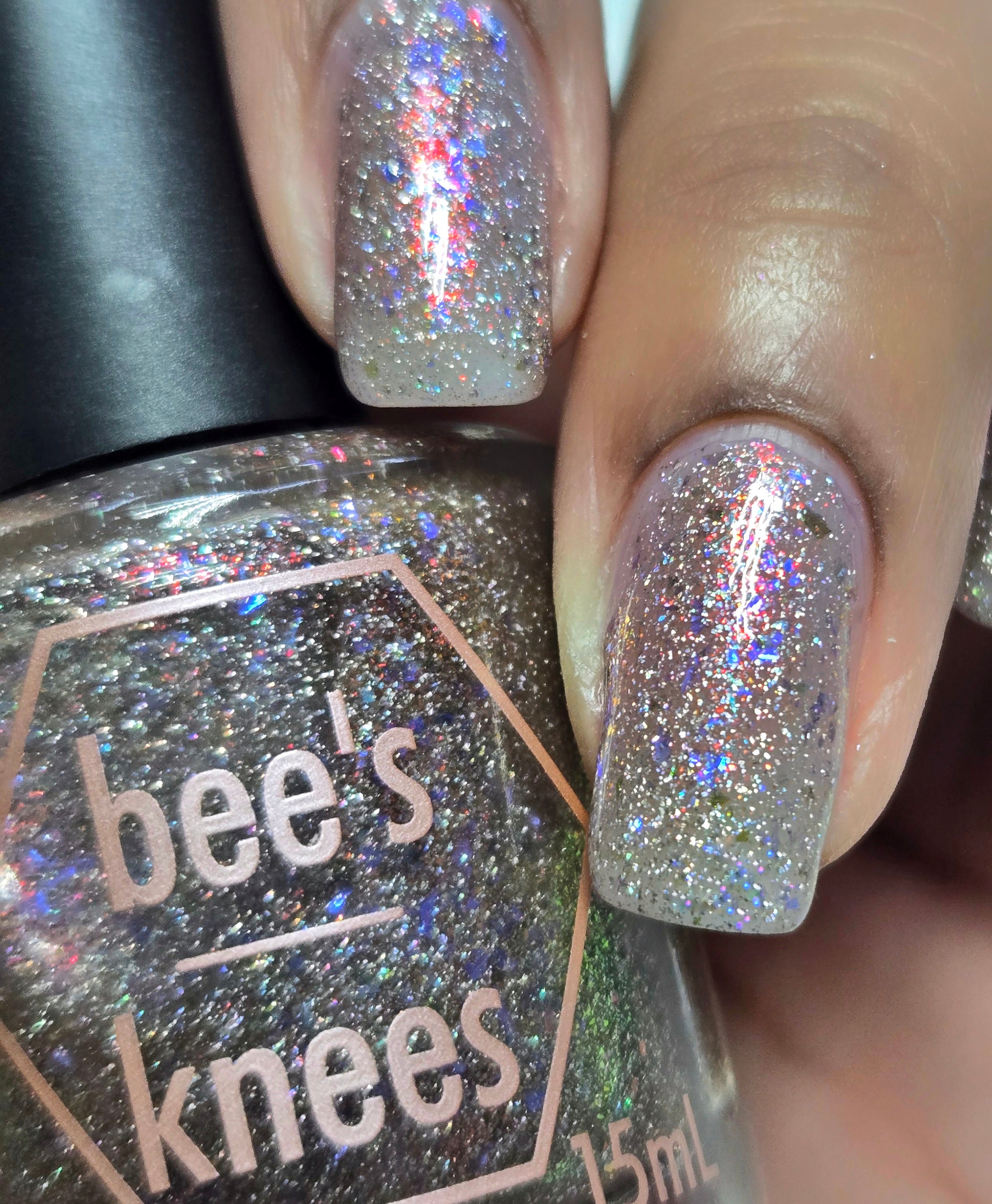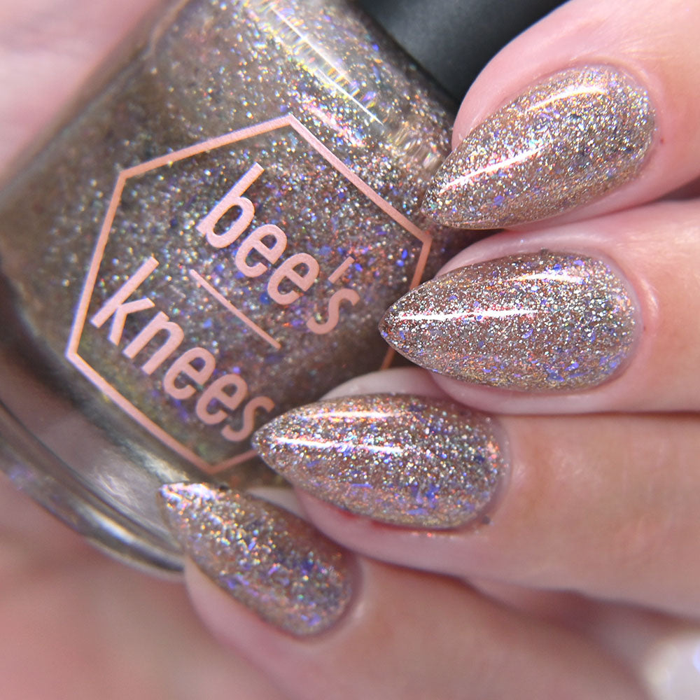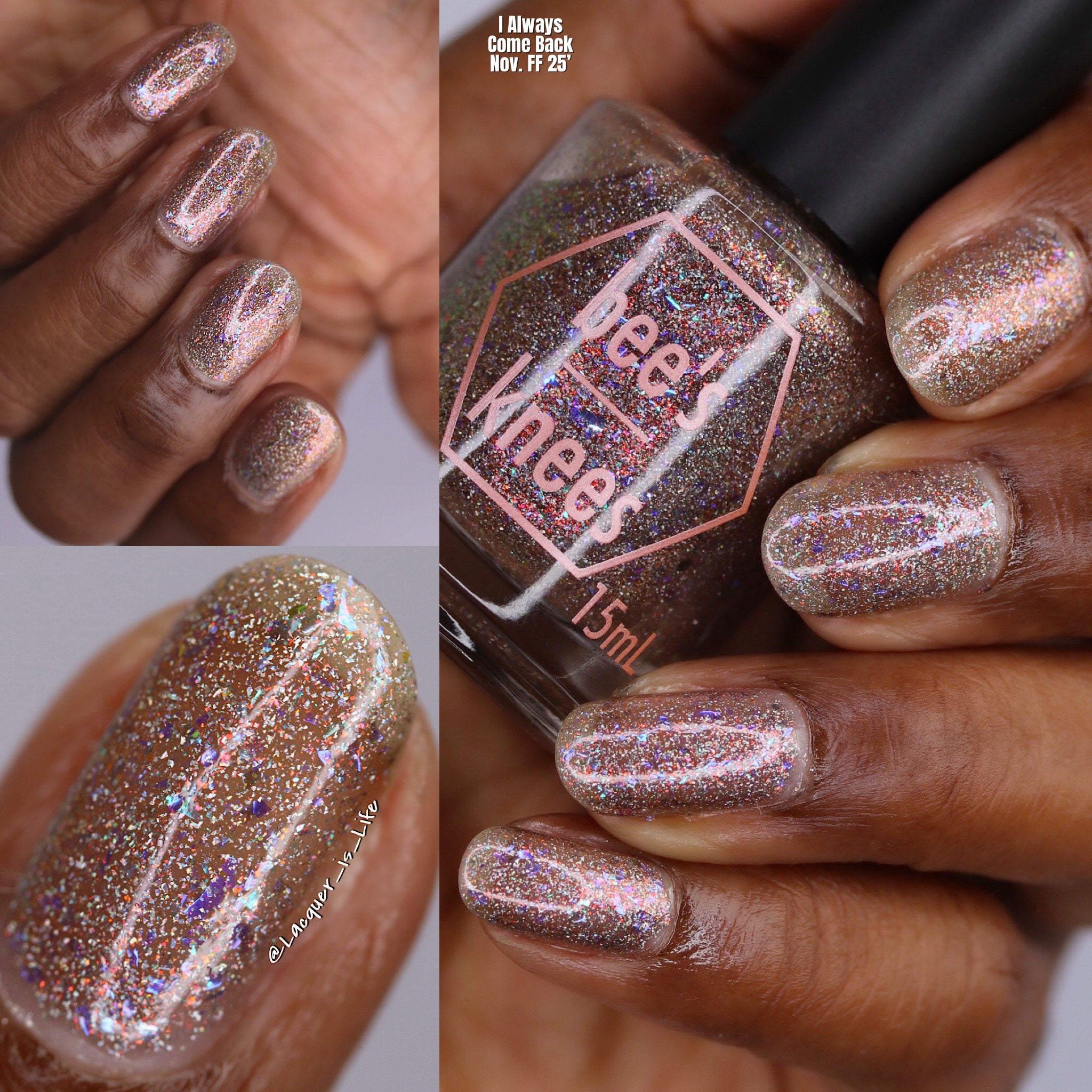 Bee's Knees I Always Come Back - this is a slightly sheer taupe with holo flakes, blue to purple iridescent flakes, and orange to gold iridescent flakes