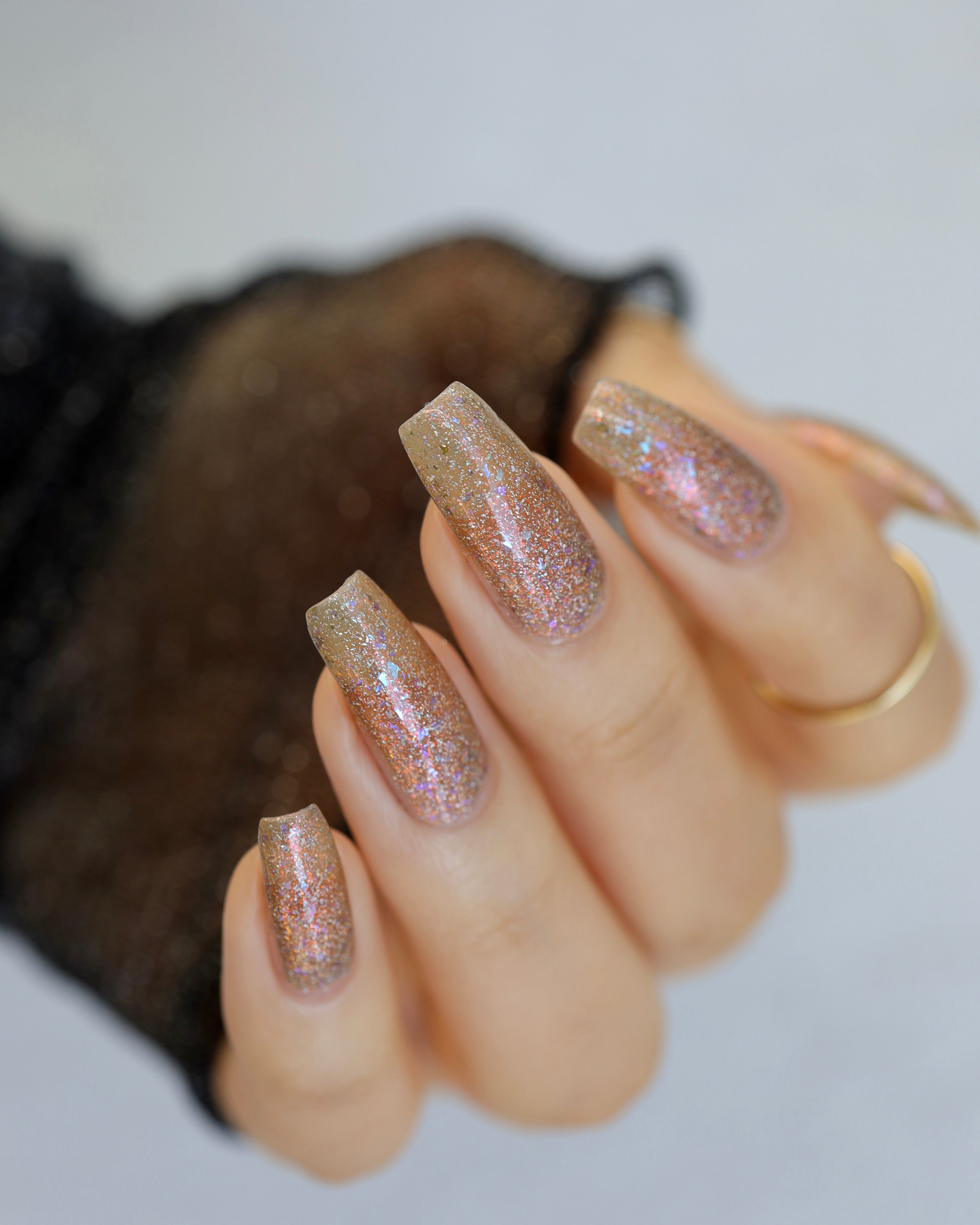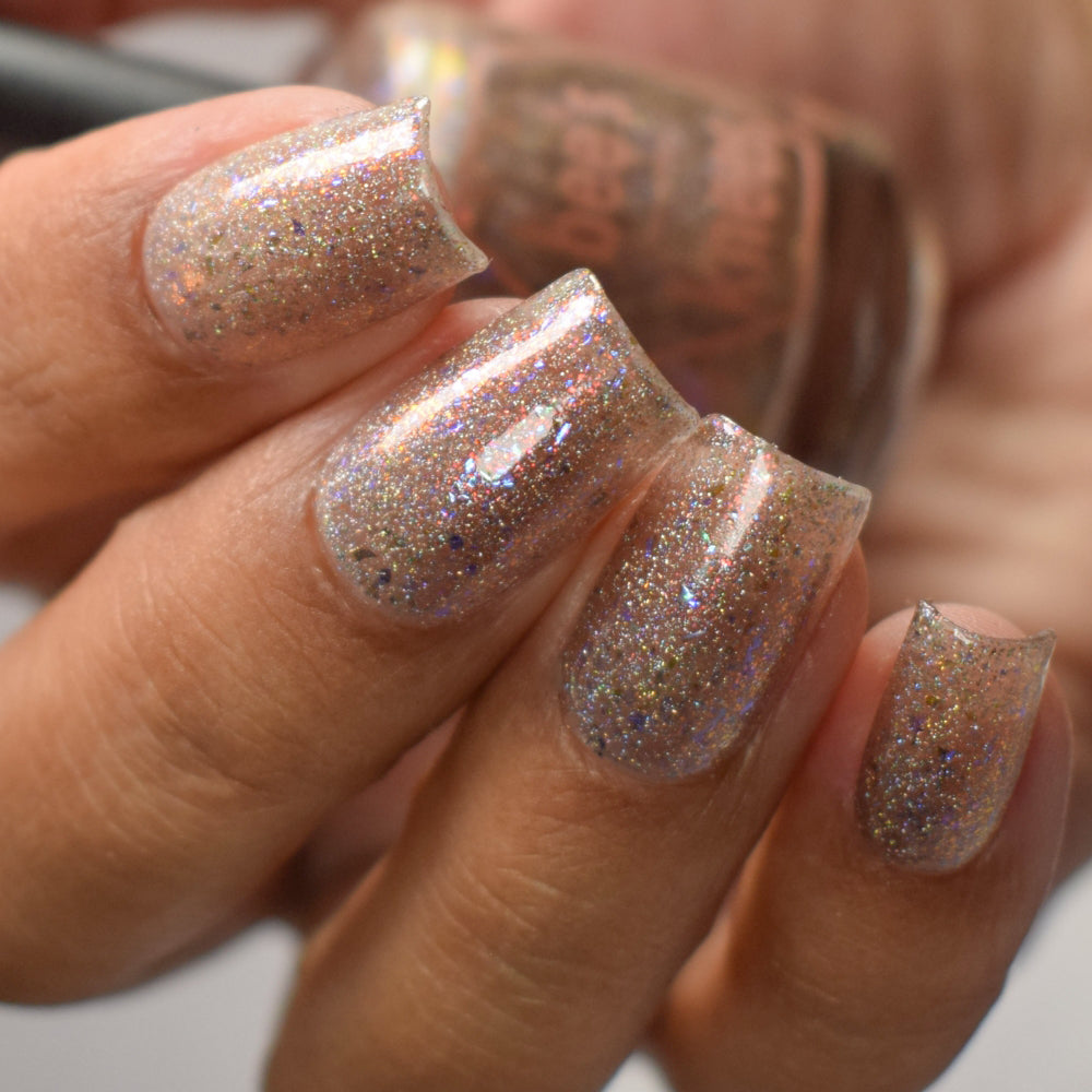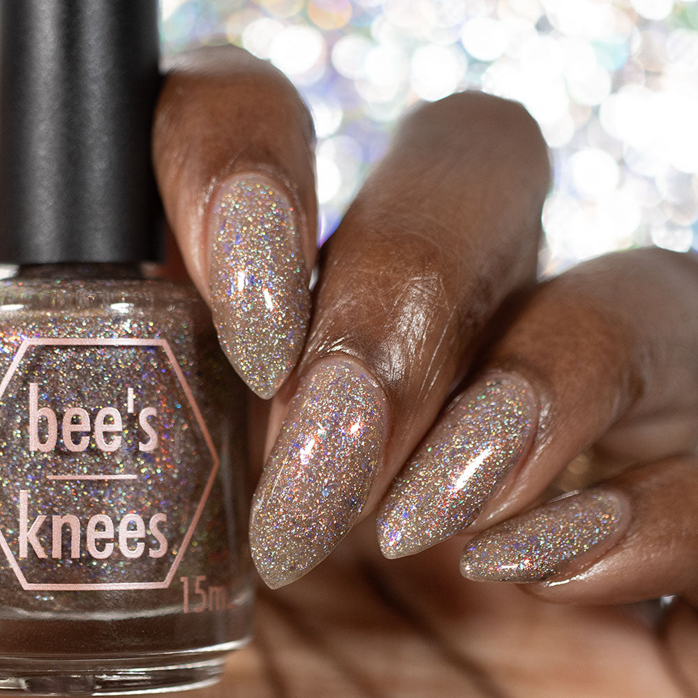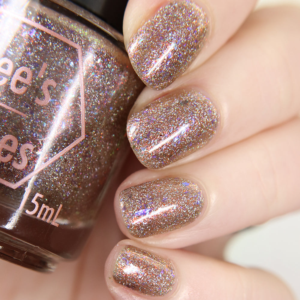 Bee's Knees I Always Come Back - this is a slightly sheer taupe with holo flakes, blue to purple iridescent flakes, and orange to gold iridescent flakes