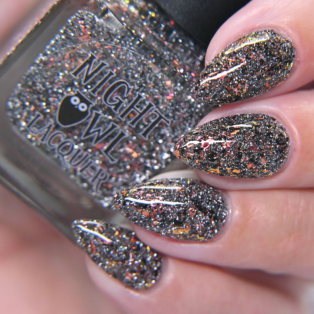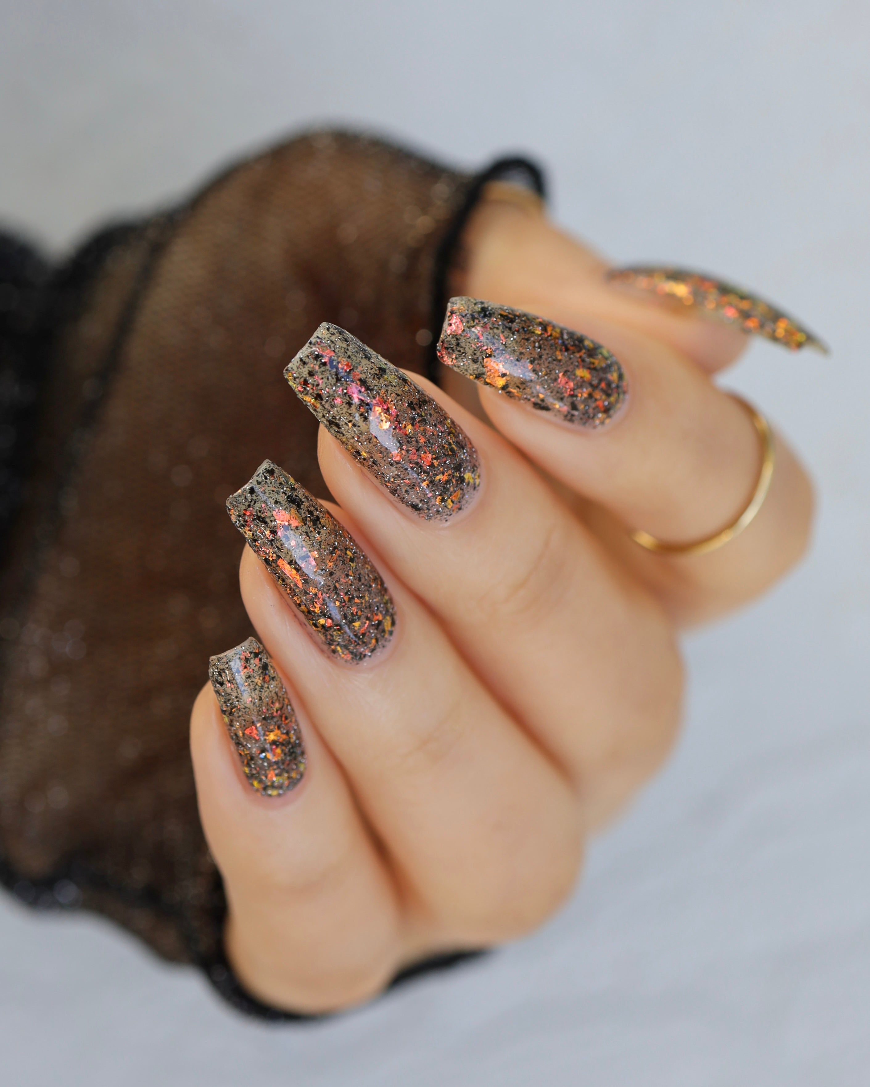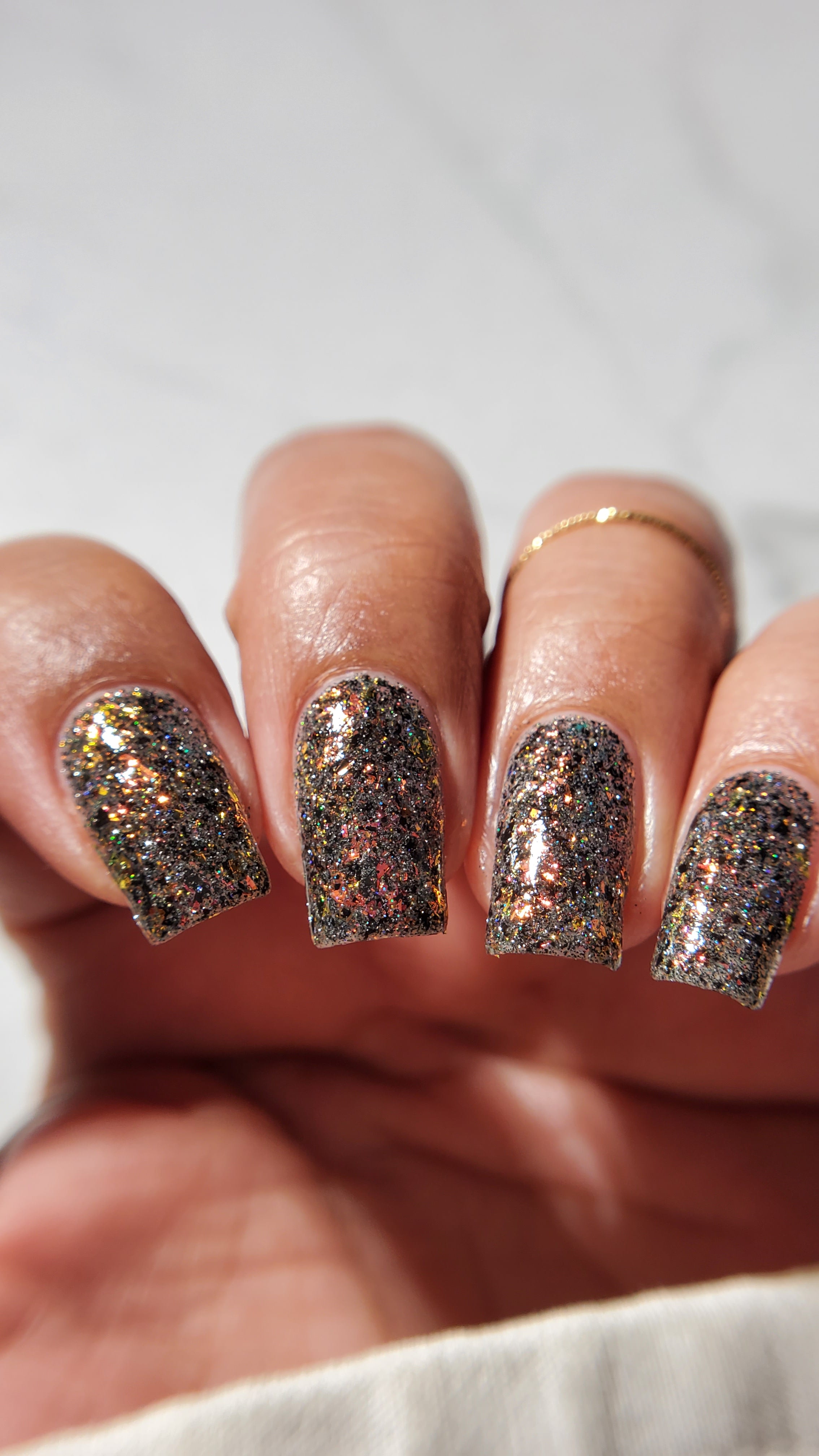 NOL's Labyrinth With No Exit - this is a clear base filled with charcoal reflective glitter pigment, black metallic flakes and vibrant crystal flakes that shift magenta/red/orange/yellow