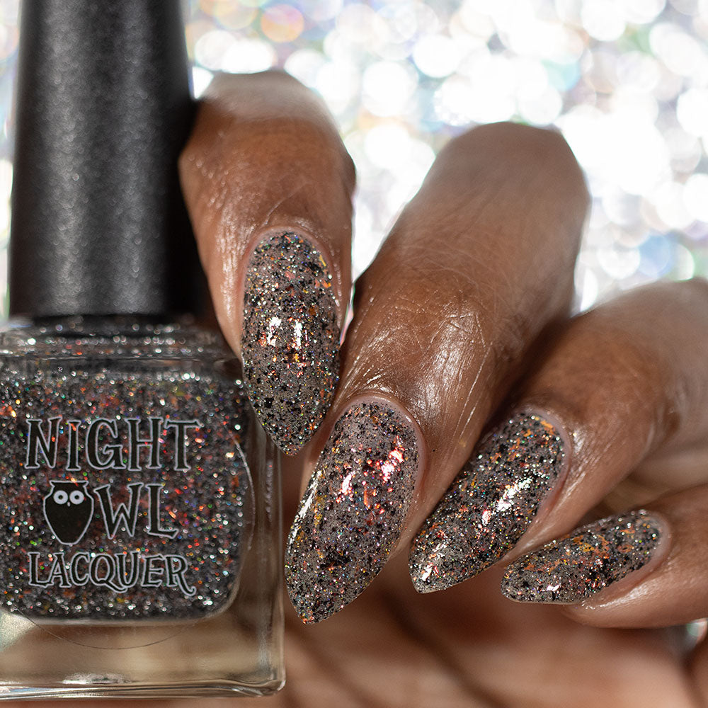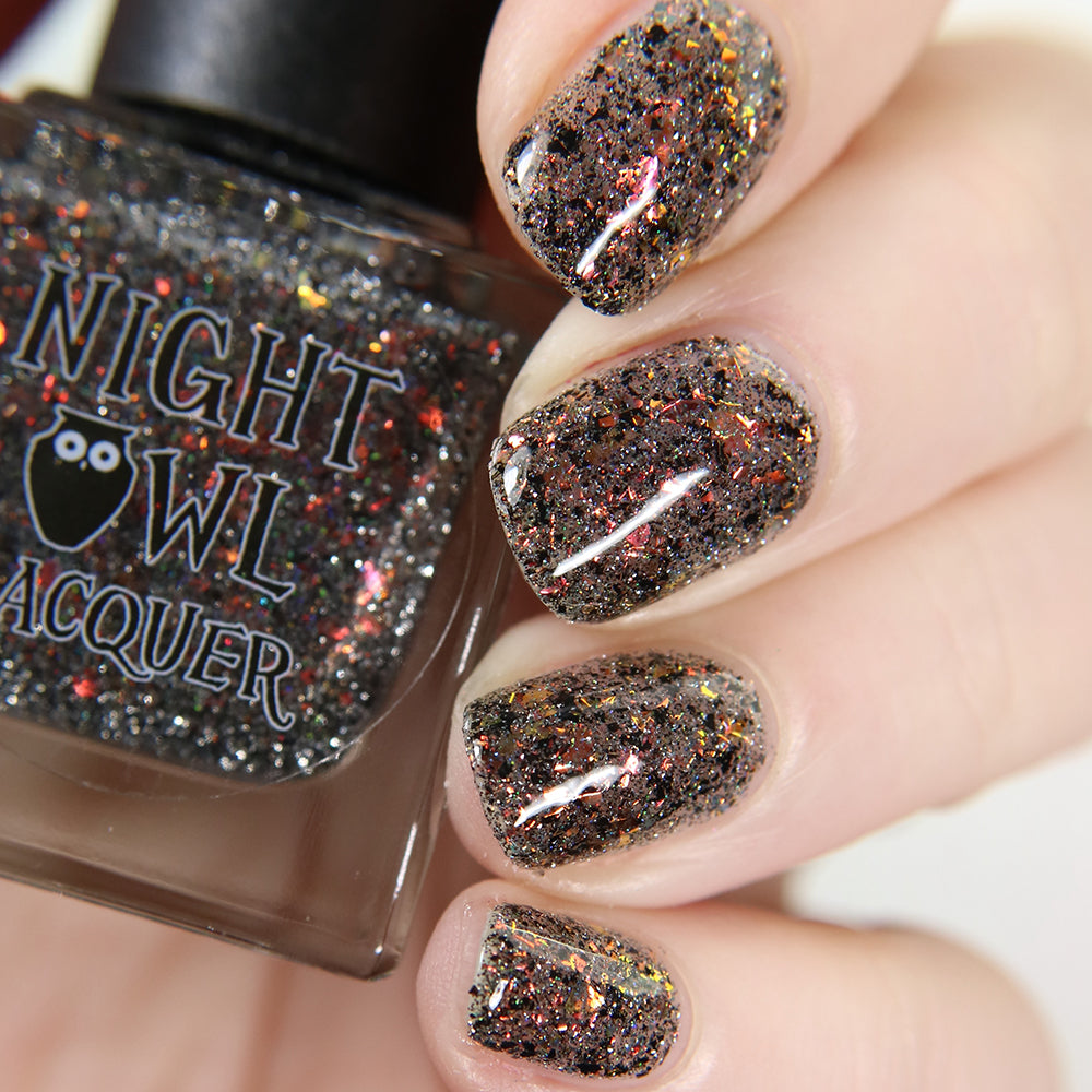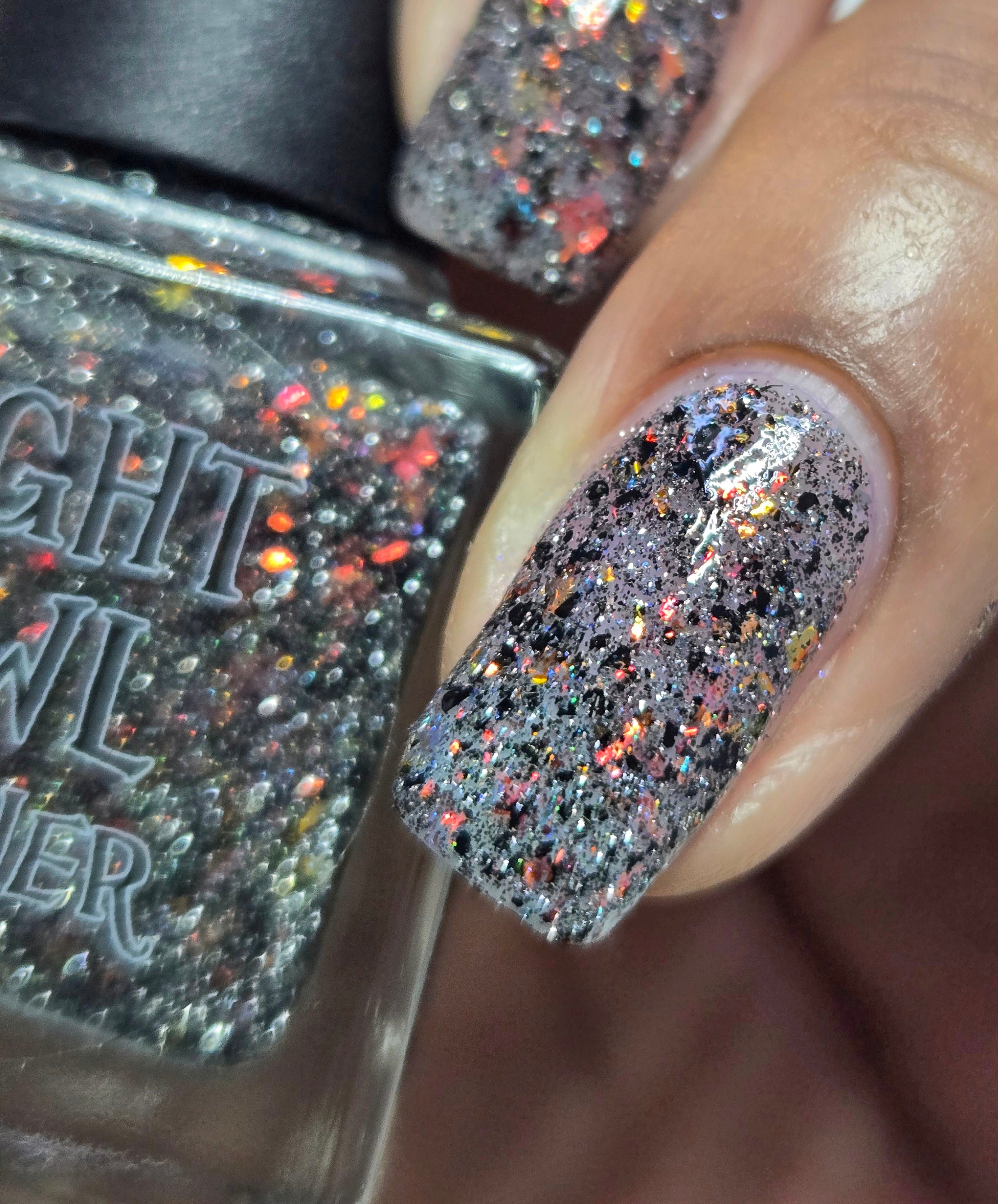 NOL's Labyrinth With No Exit - this is a clear base filled with charcoal reflective glitter pigment, black metallic flakes and vibrant crystal flakes that shift magenta/red/orange/yellow