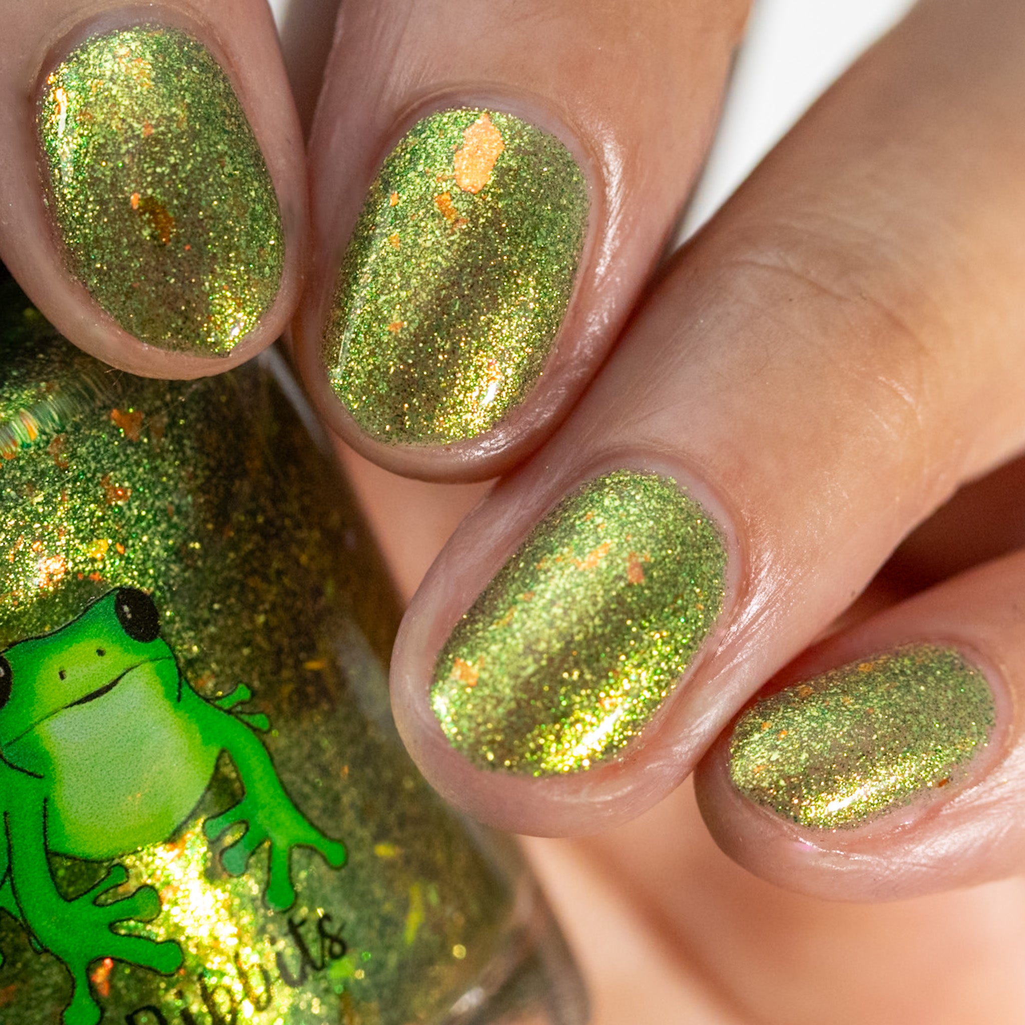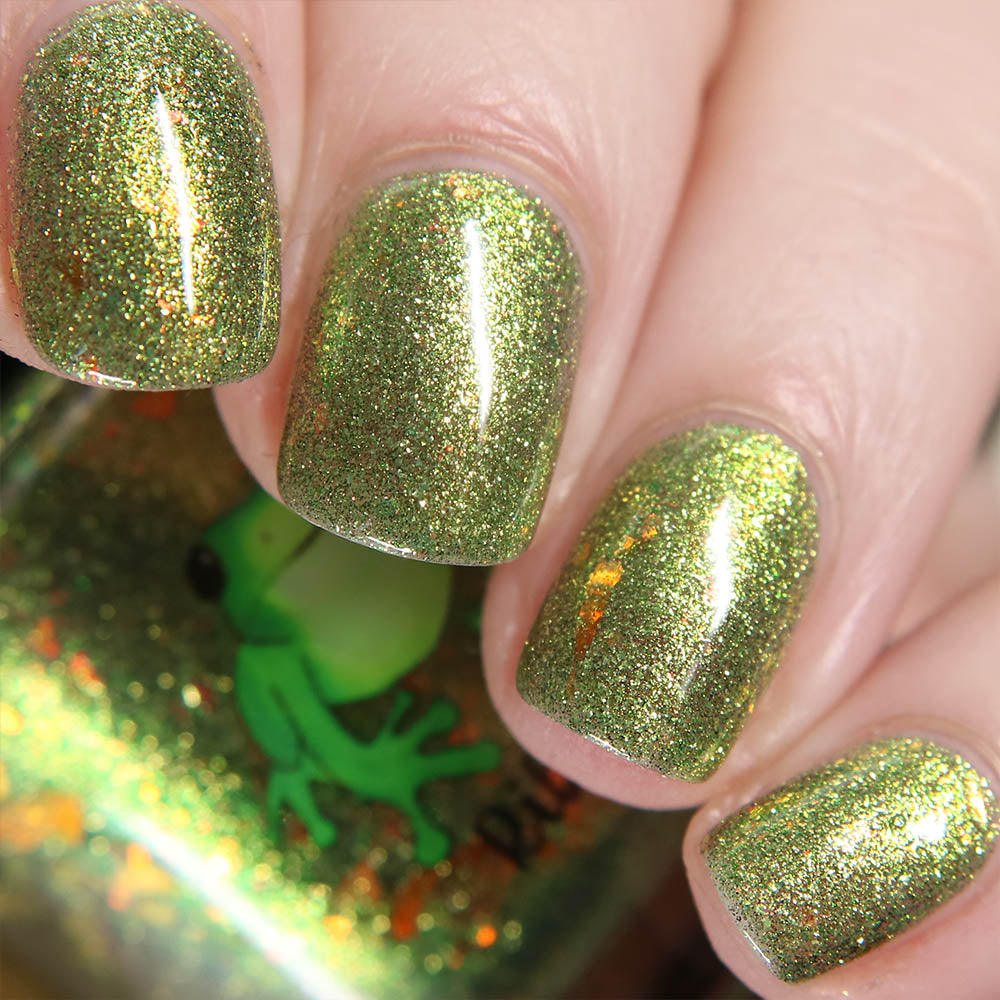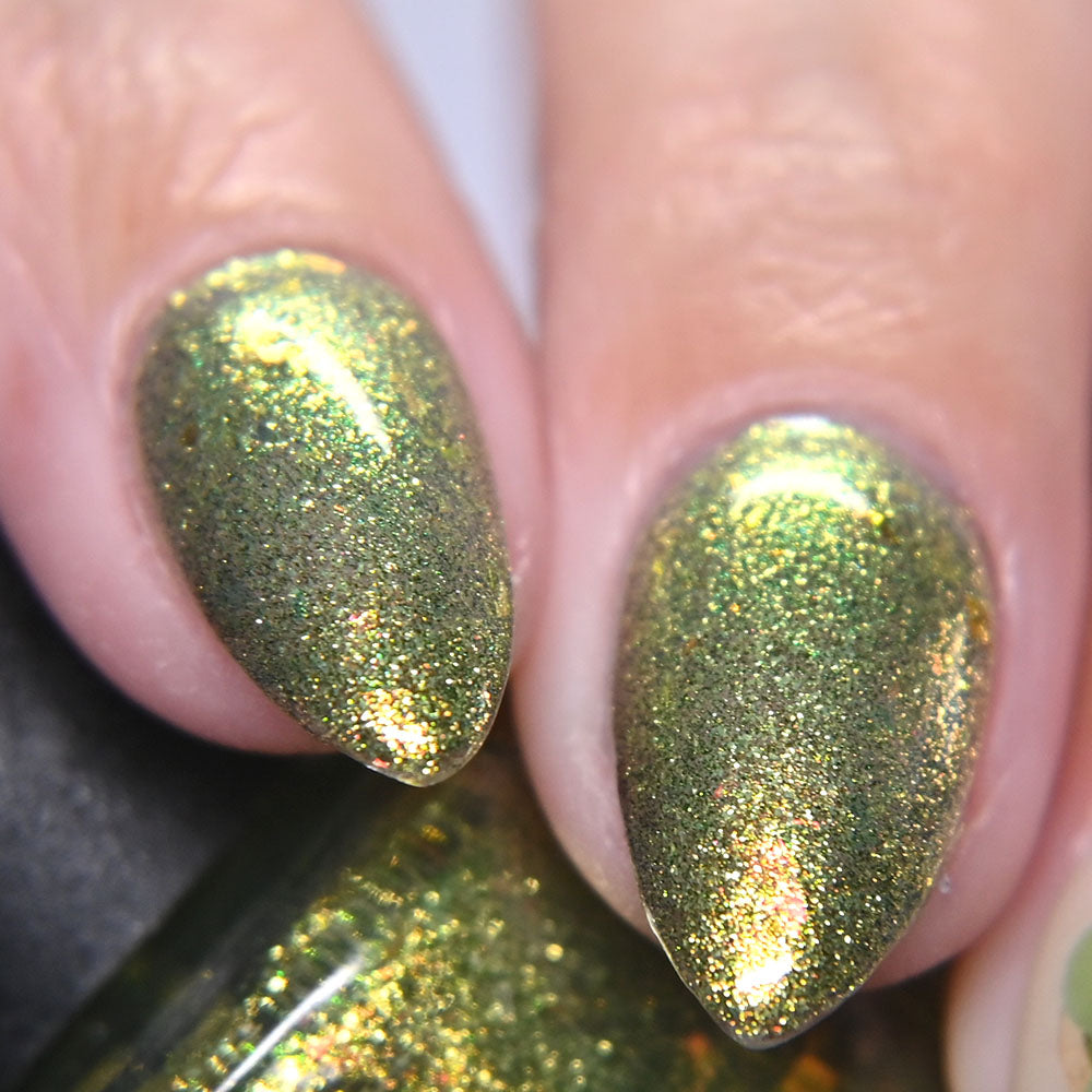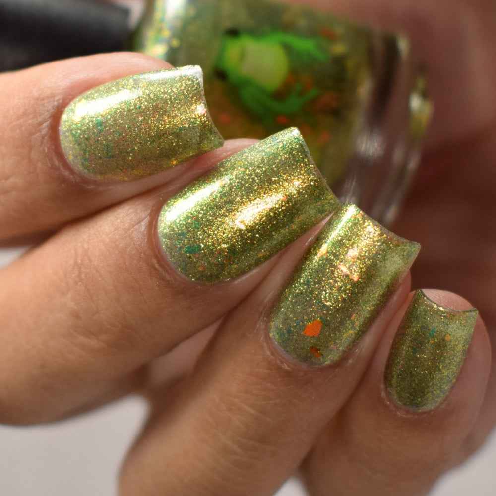 a green to yellow multichrome base with olive green metallic flakes and orange to yellow glass flakes!