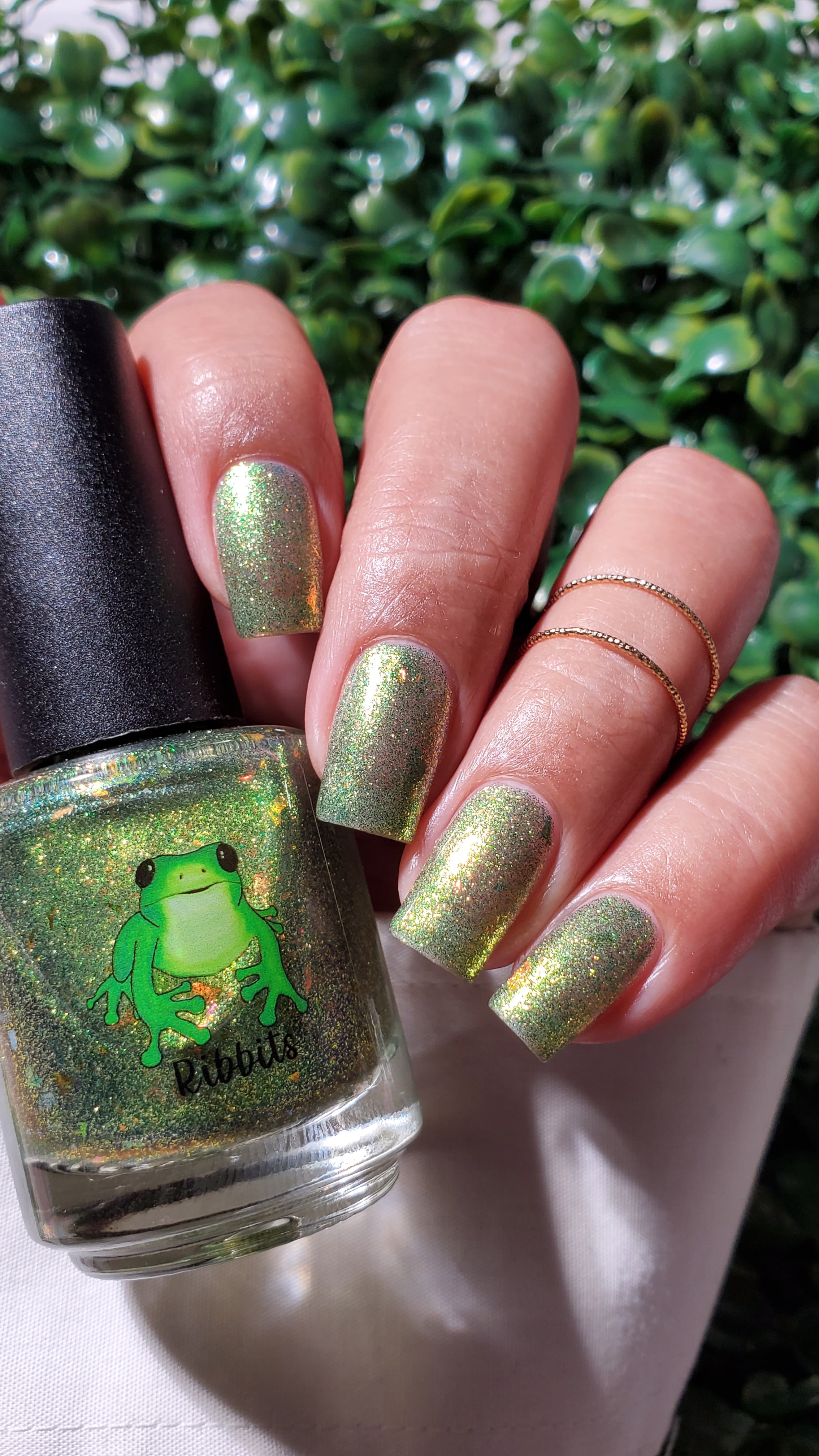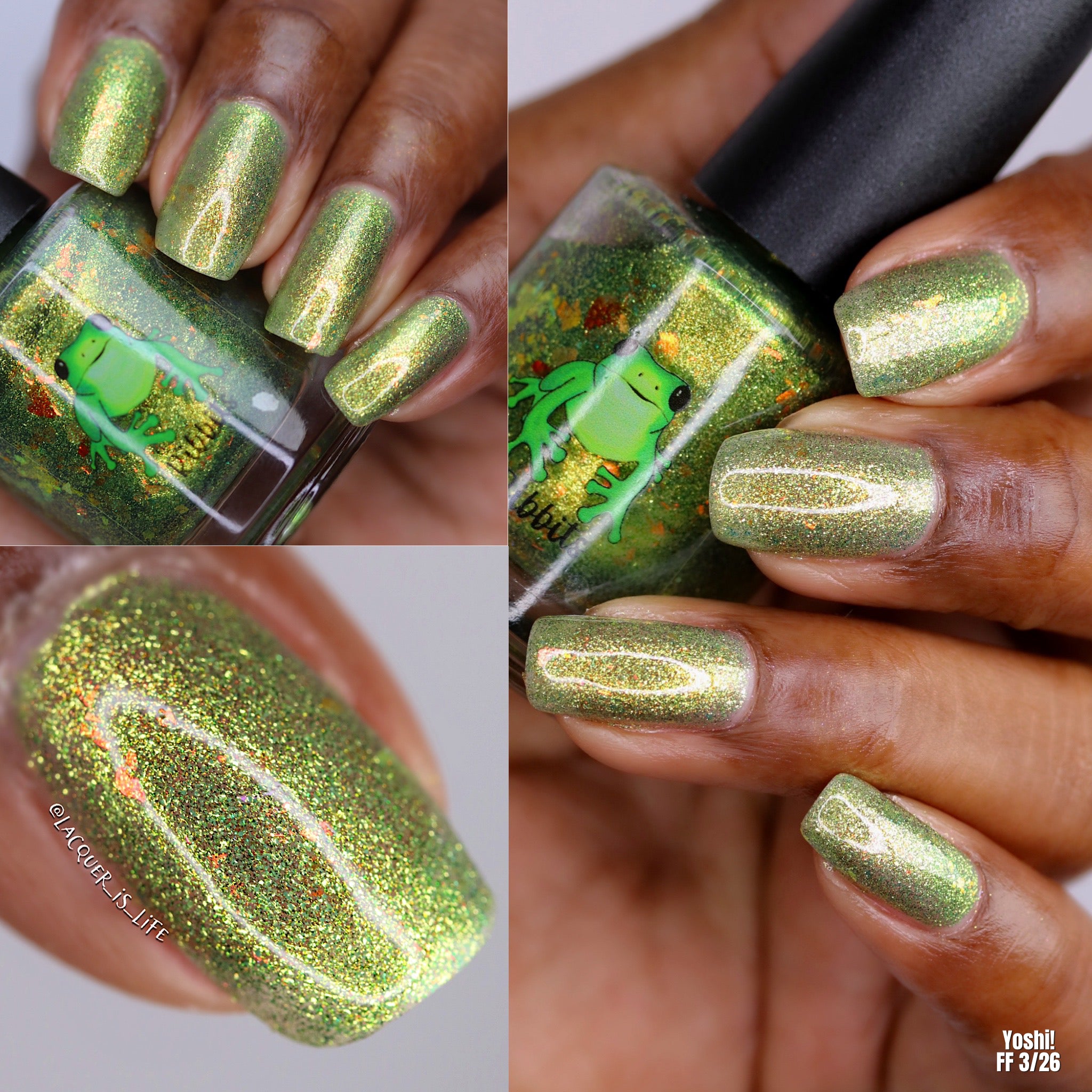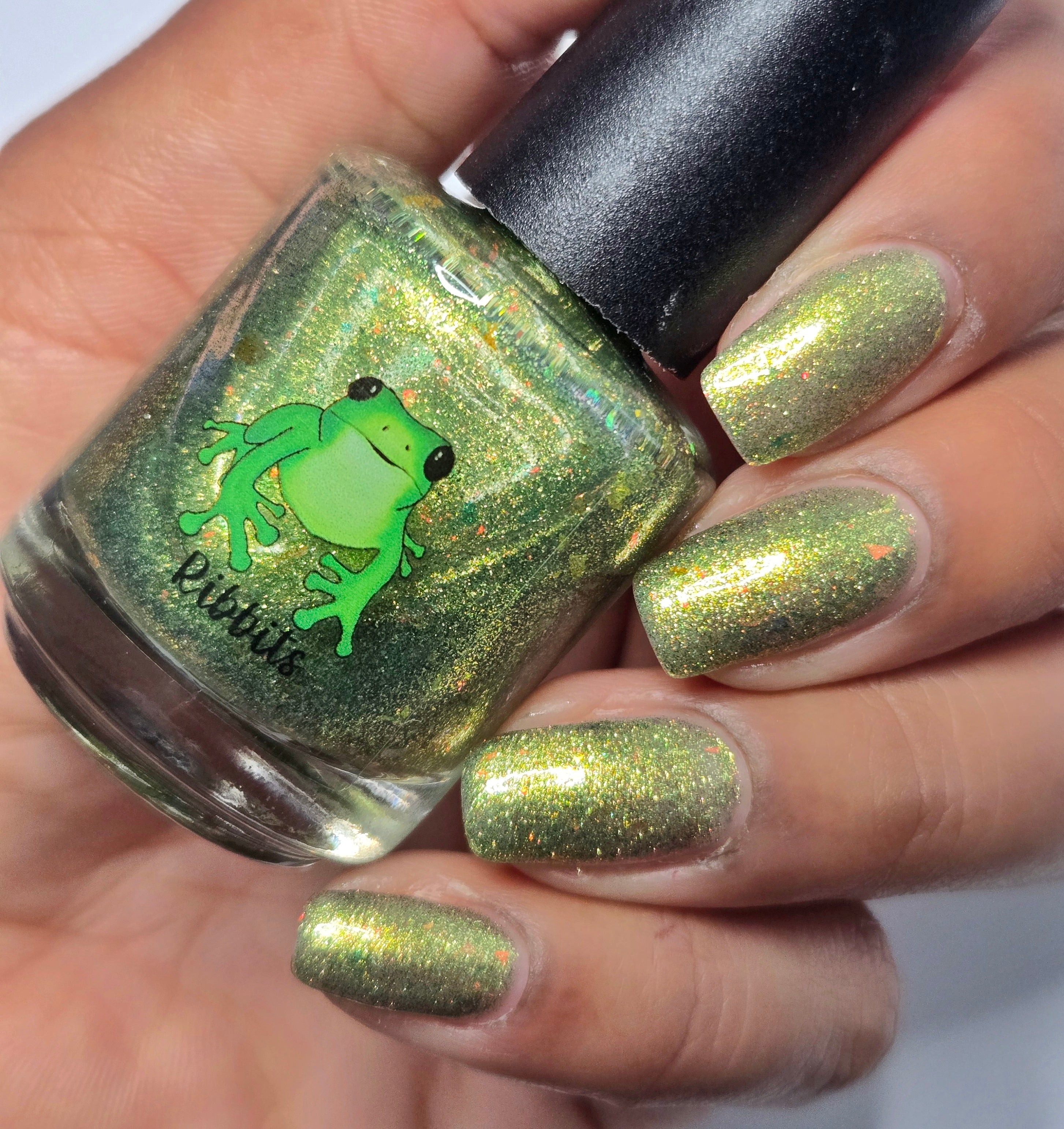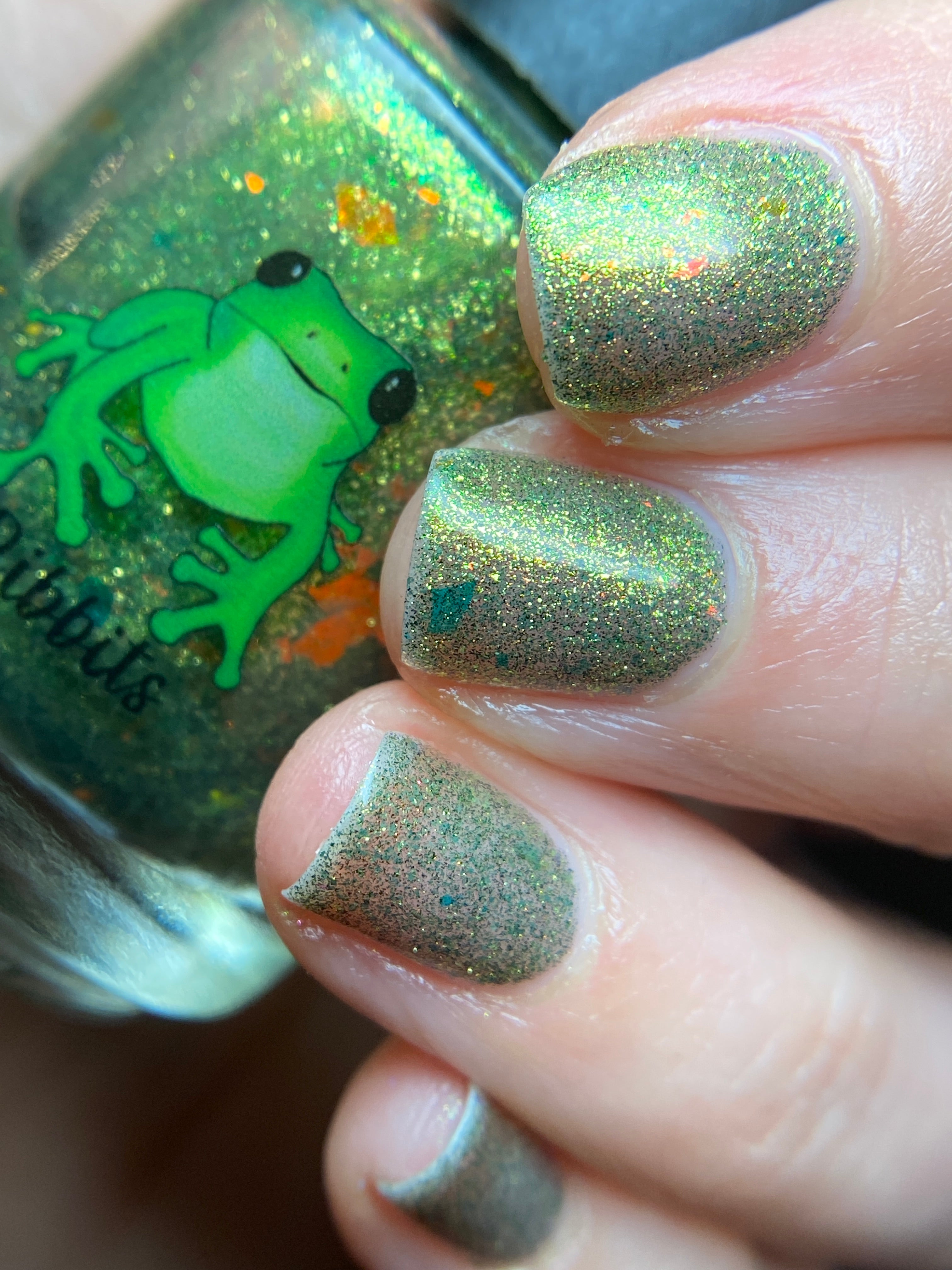 a green to yellow multichrome base with olive green metallic flakes and orange to yellow glass flakes!